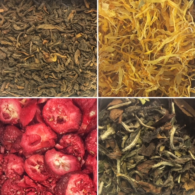 | Clockwise from top left: Pu-erh, marigold, Pai Mu Tan, cranberry |