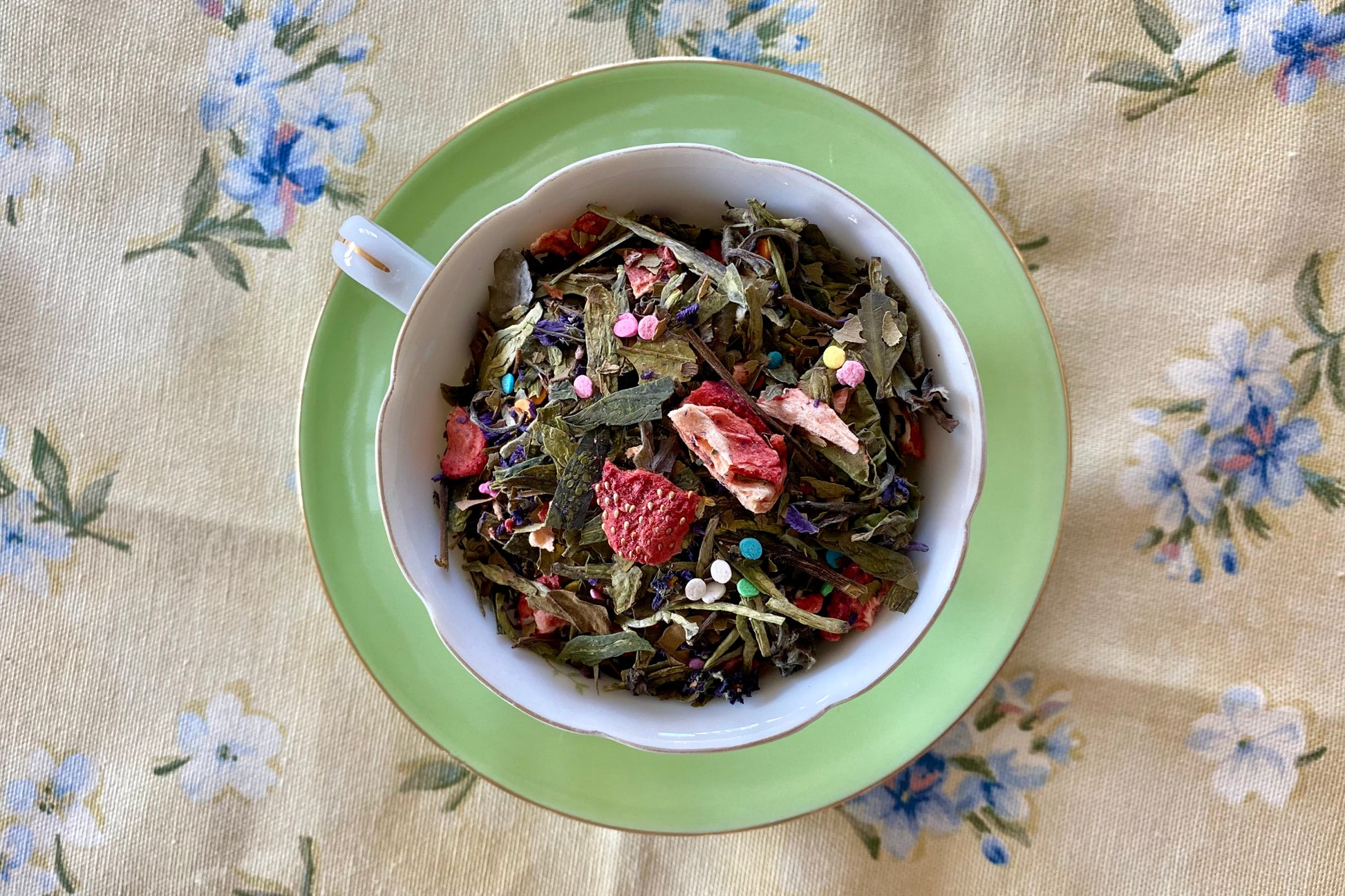 Ingredients: Green tea, strawberry, white tea, lemon myrtle, rainbow sprinkles*, sweet violet