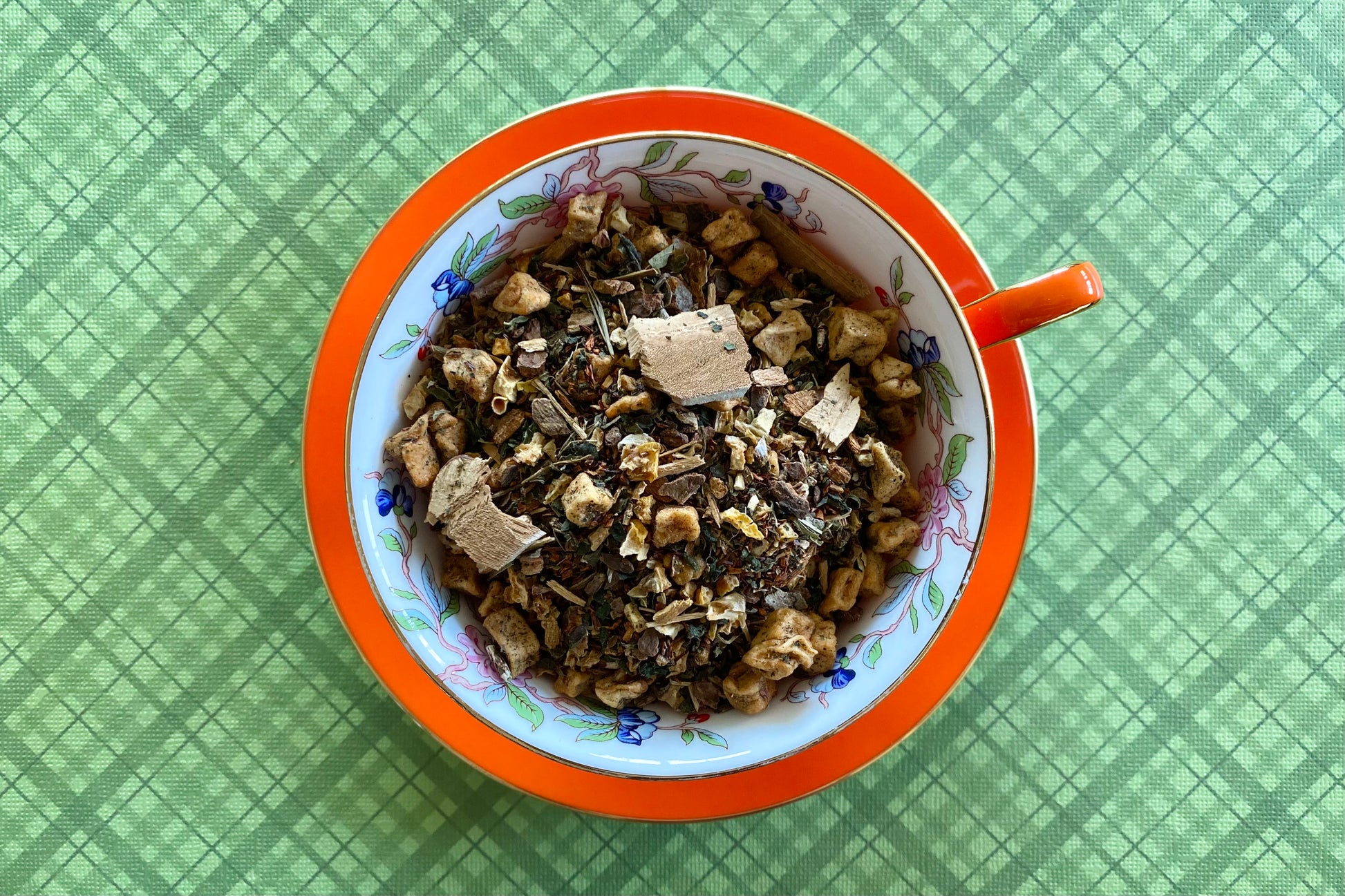 Ingredients: Apple, rooibos, lemon peel, wild cherry bark, nettle leaf, reishi mushroom, raw dandelion root