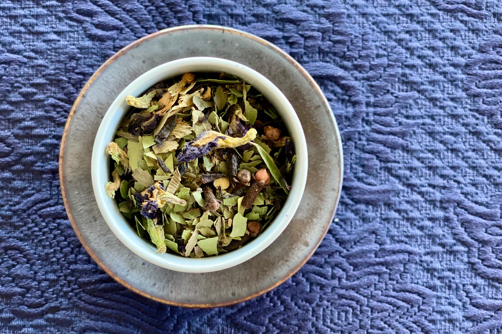 Right from the start, as everything floats up in the infuser, there's a watery vibe as I poke things down and it's all soft and water-weedy. The pea-flower purple is deep and rich. First time trying a Yaupon blend, so I'm not sure which note is the holly. The clove stands out at first (mostly because I love clove). But everything else is very well blended into a slightly mineral, faintly smokey cup that leaves the edge of my tongue tingling with clove. Kept me going all afternoon halfway through this dragging, time-change week.