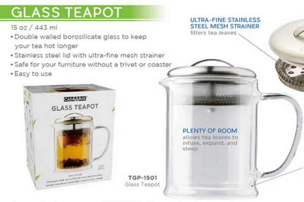 Double-walled borosilicate glass keeps your tea hot for ages! This pot has a capacity of 15 ounces and an ultra-fine stainless steel mesh strainer to filter the tea leaves. This style of teapot has capacity to allow the tea leaves to bloom.