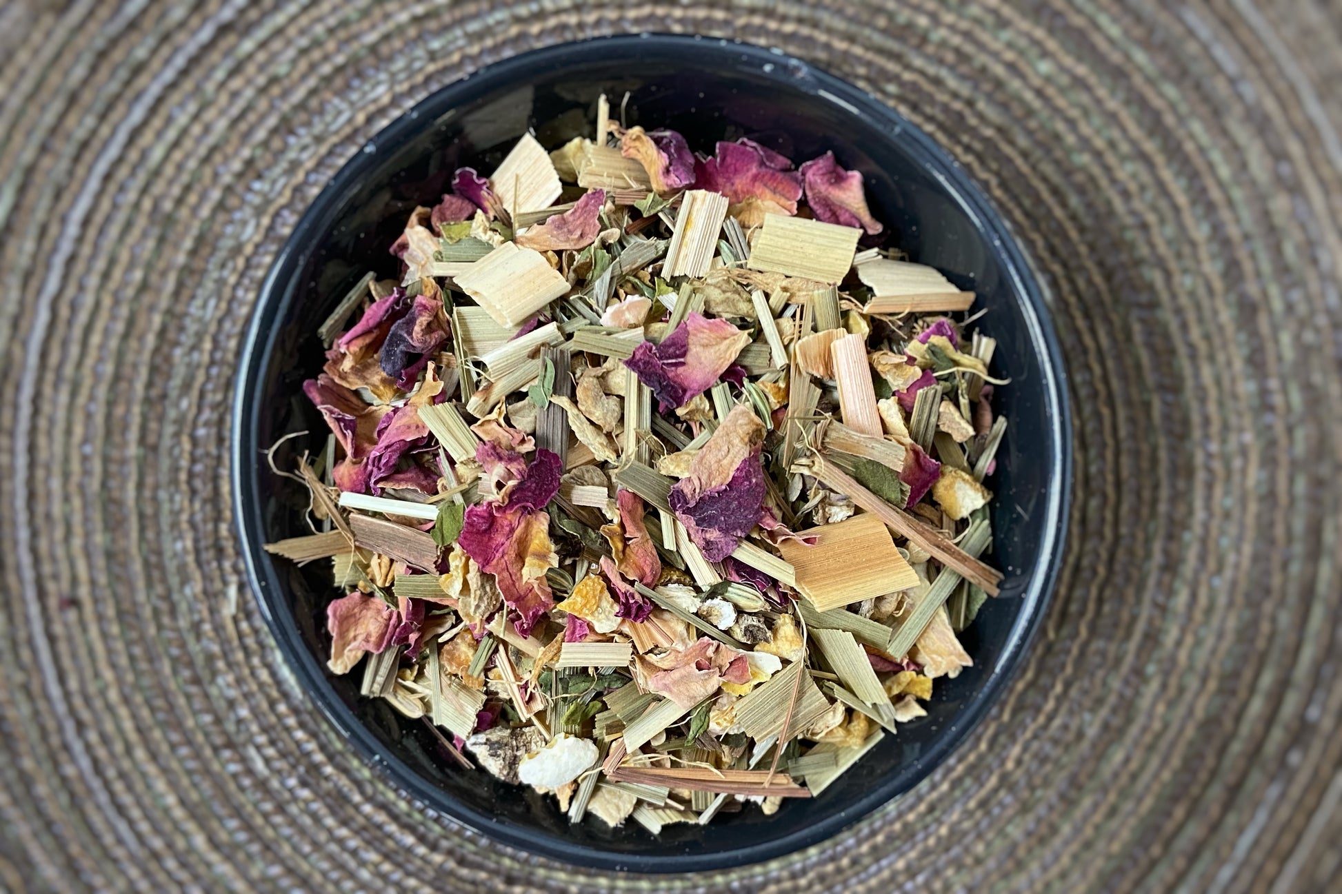 Ingredients: Raw dandelion root, lemongrass, ginger, fennel, orange peel, peppermint, rose petal