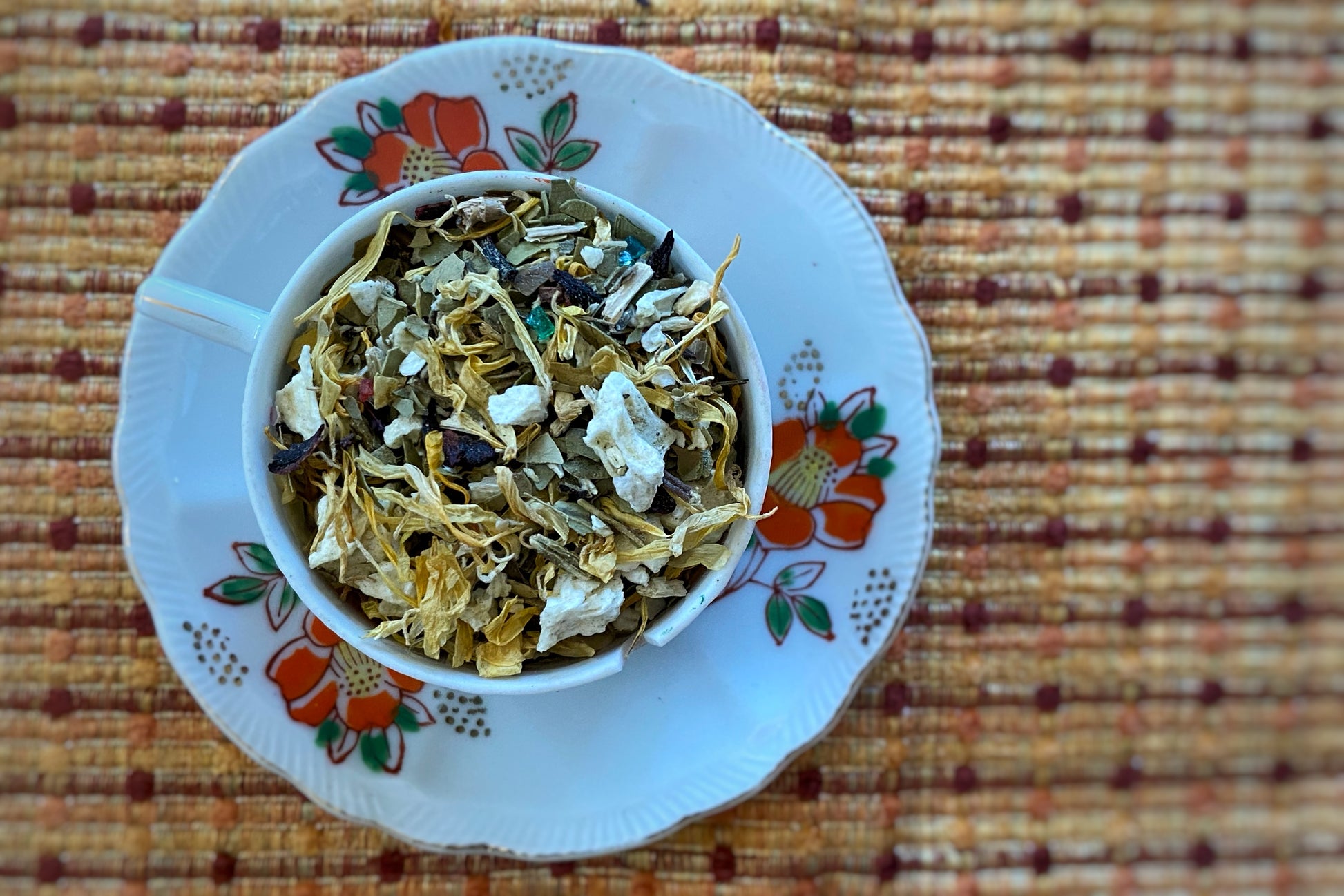 Ingredients: Yerba mate, pineapple, rainbow sugar*, hibiscus, marigold, natural peach flavoring