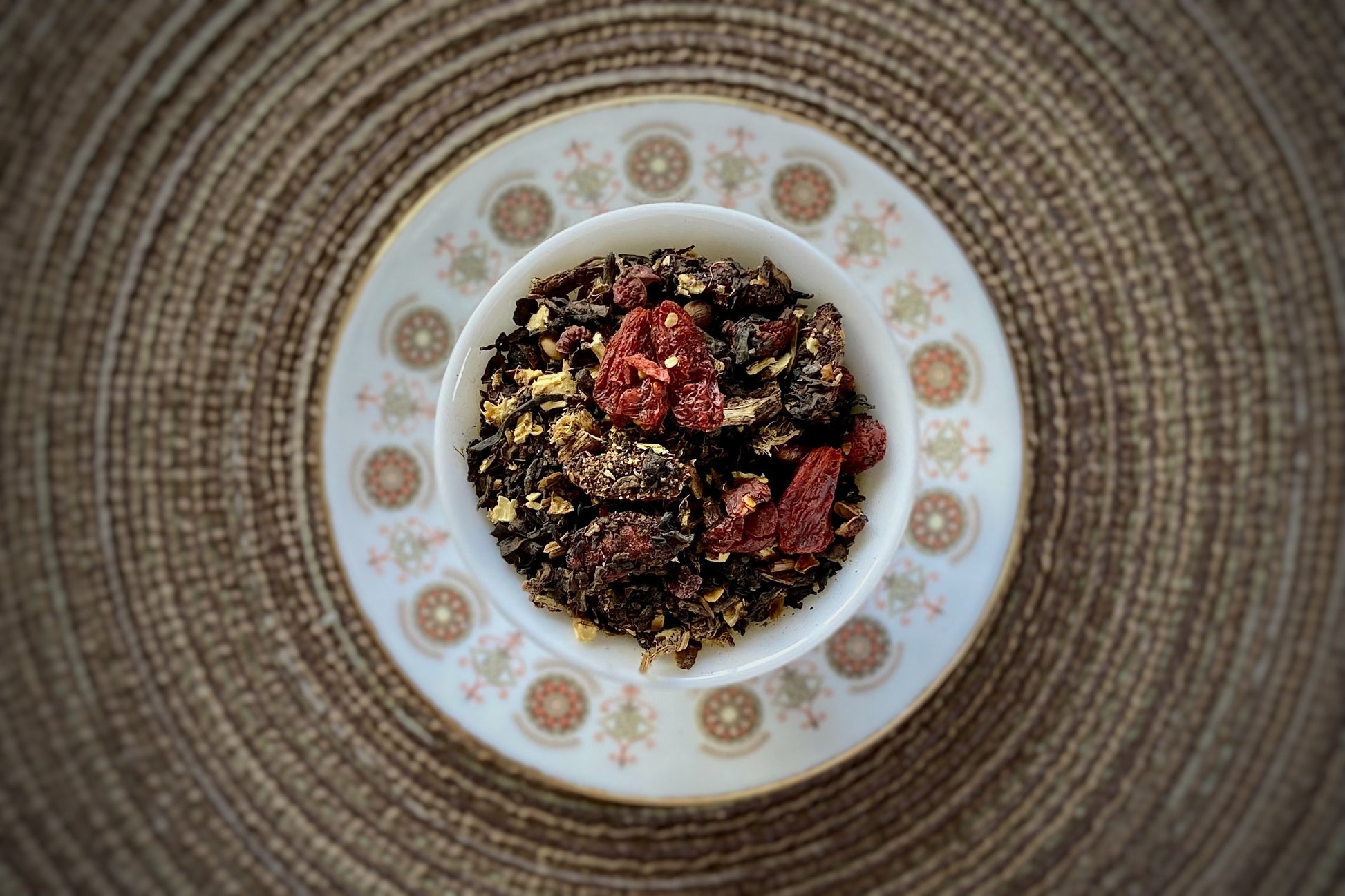 Ingredients: Aged dark tea, goji berry, licorice root, black peppercorn, serrano chili flake, Szechuan peppercorn