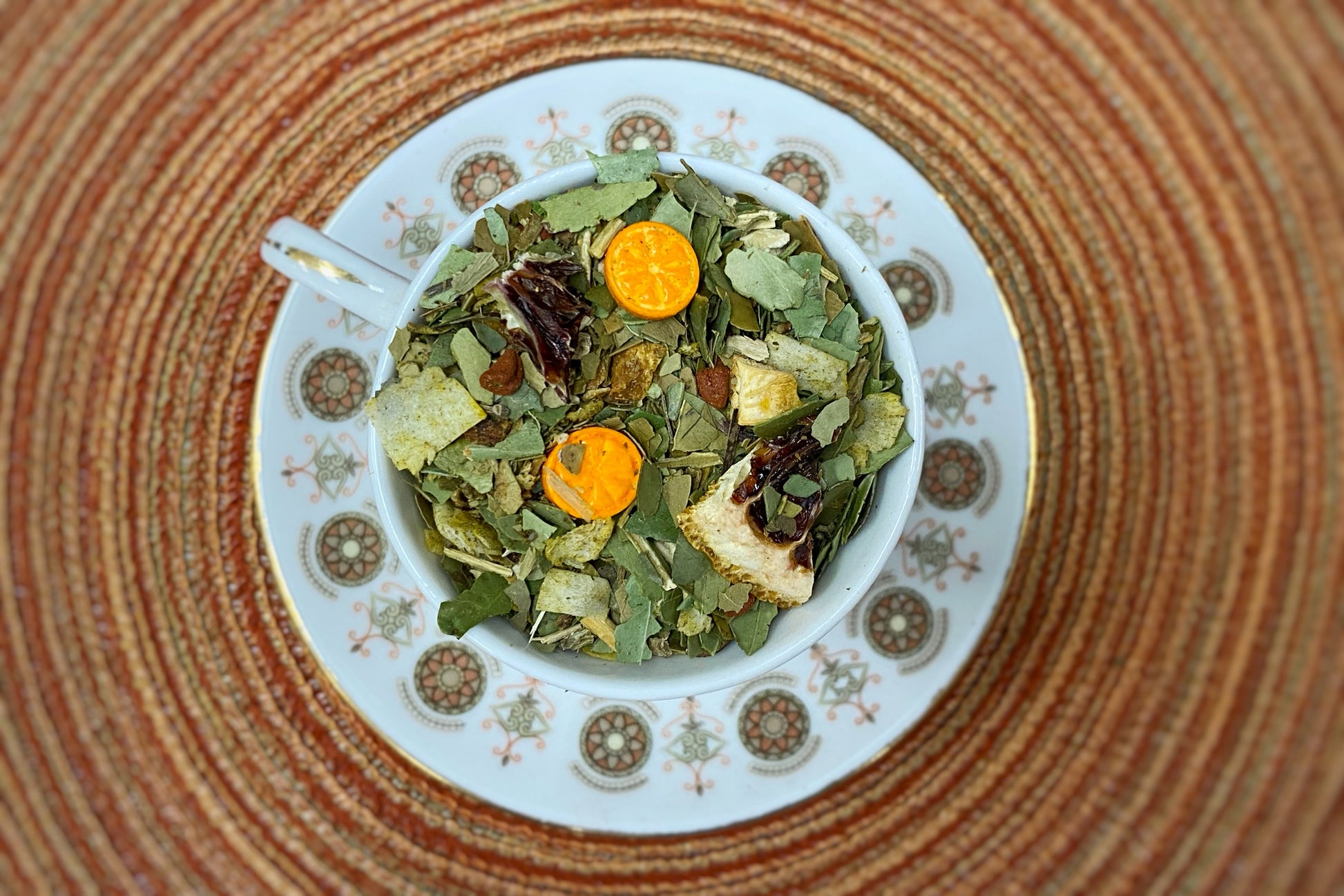 Ingredients: Green yaupon holly, yerba mate, annatto seed, orange peel, blood orange, shaved coconut, orange sprinkles*, lime peel, natural coconut flavoring