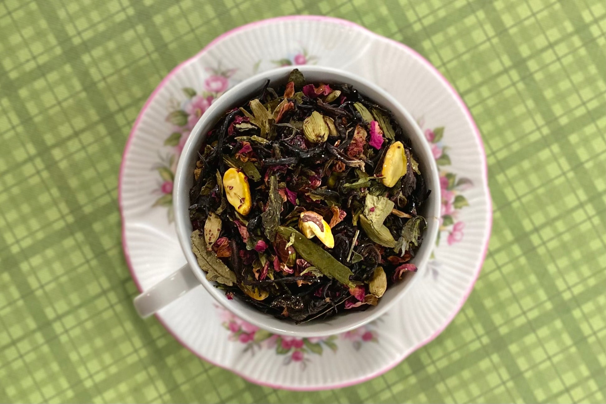 Ingredients: Black tea, roasted pistachio, green tea, cardamom, rose petal, vanilla oil, gold lustre dust*