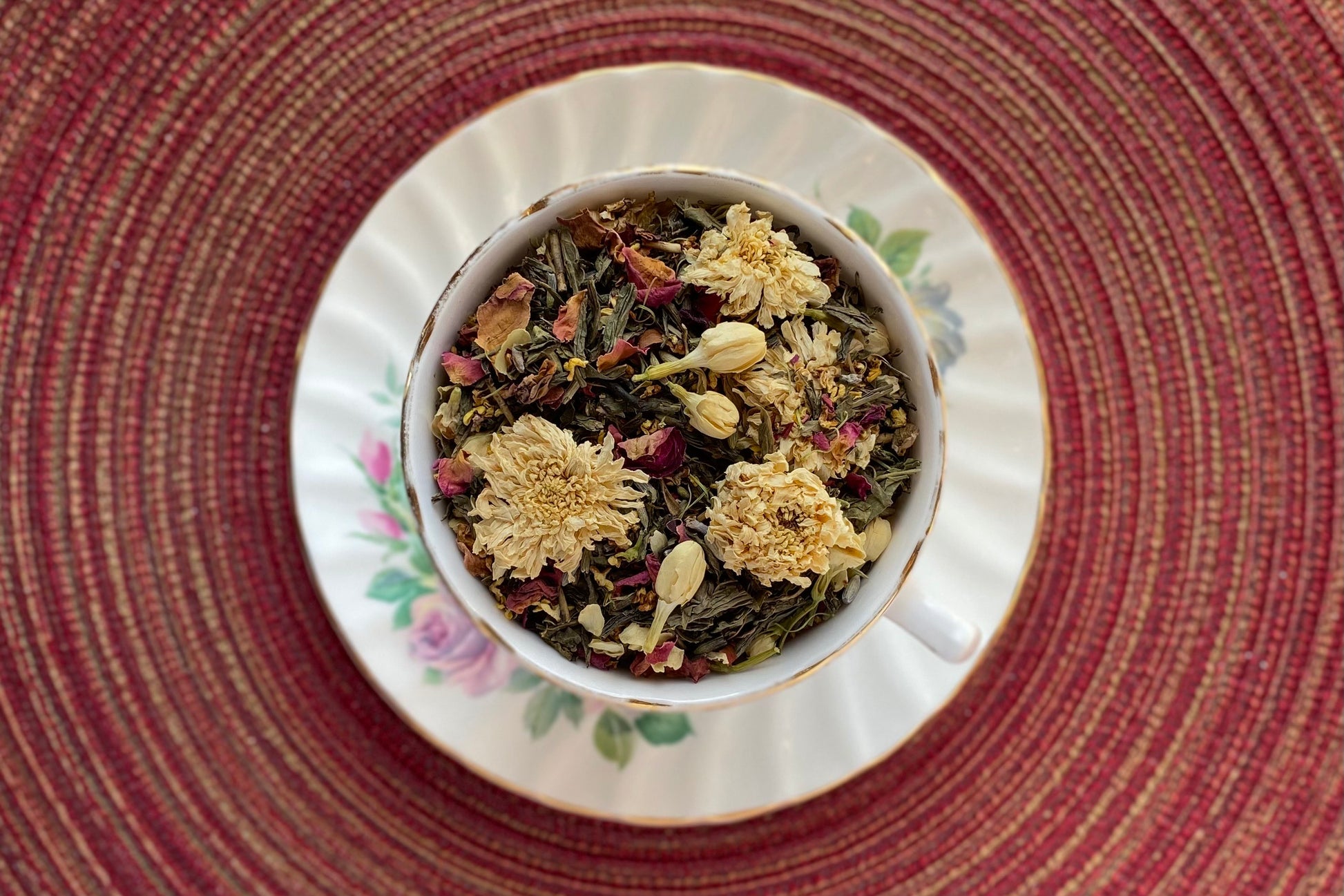 Ingredients: Decaf green tea, osmanthus, chrysanthemum, jasmine flower, rose petal, lavender