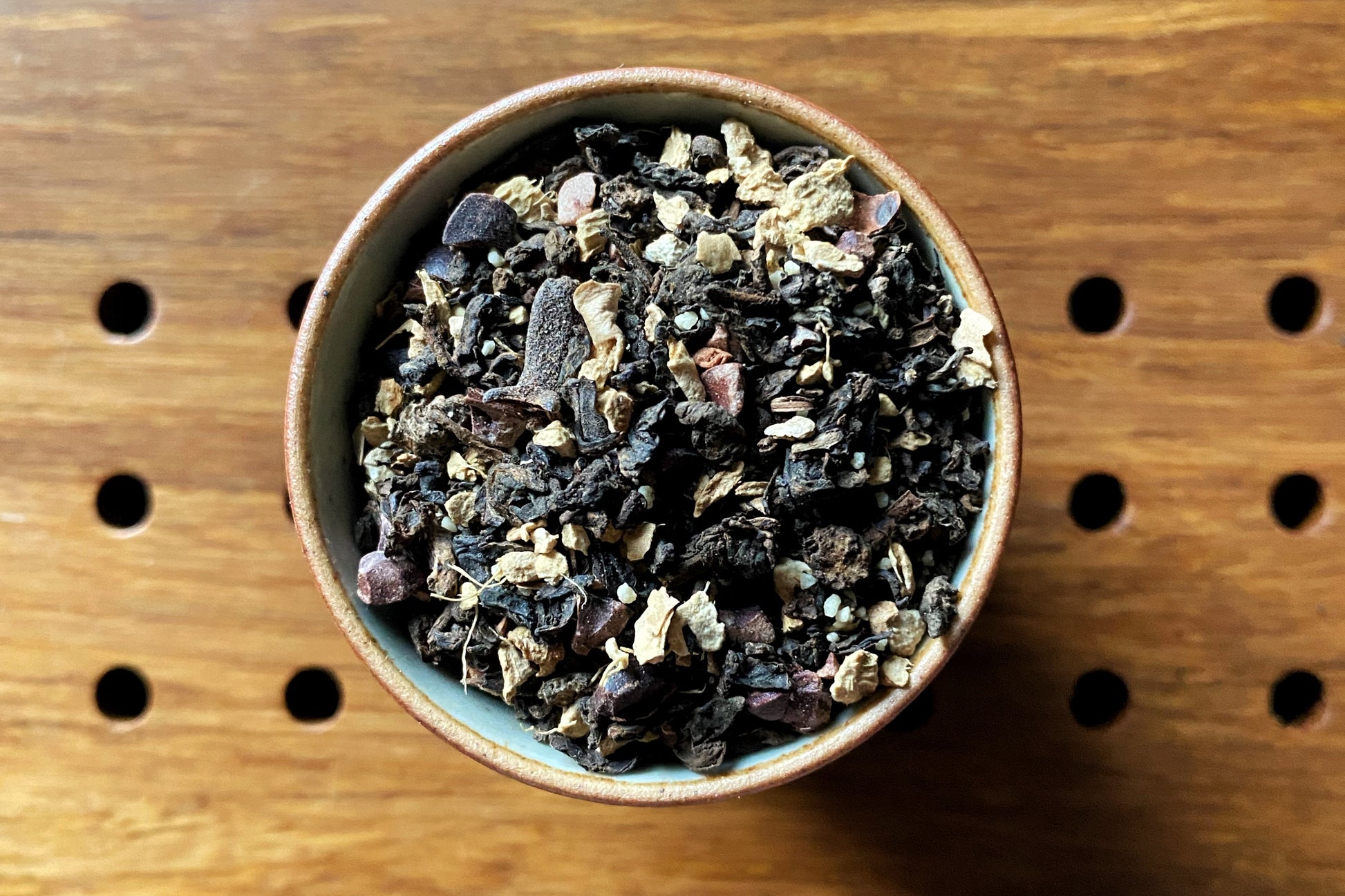 Ingredients: Aged dark tea, cacao nib, spicy ginger, honey granules (cane sugar, honey), clove, natural chocolate fudge flavoring