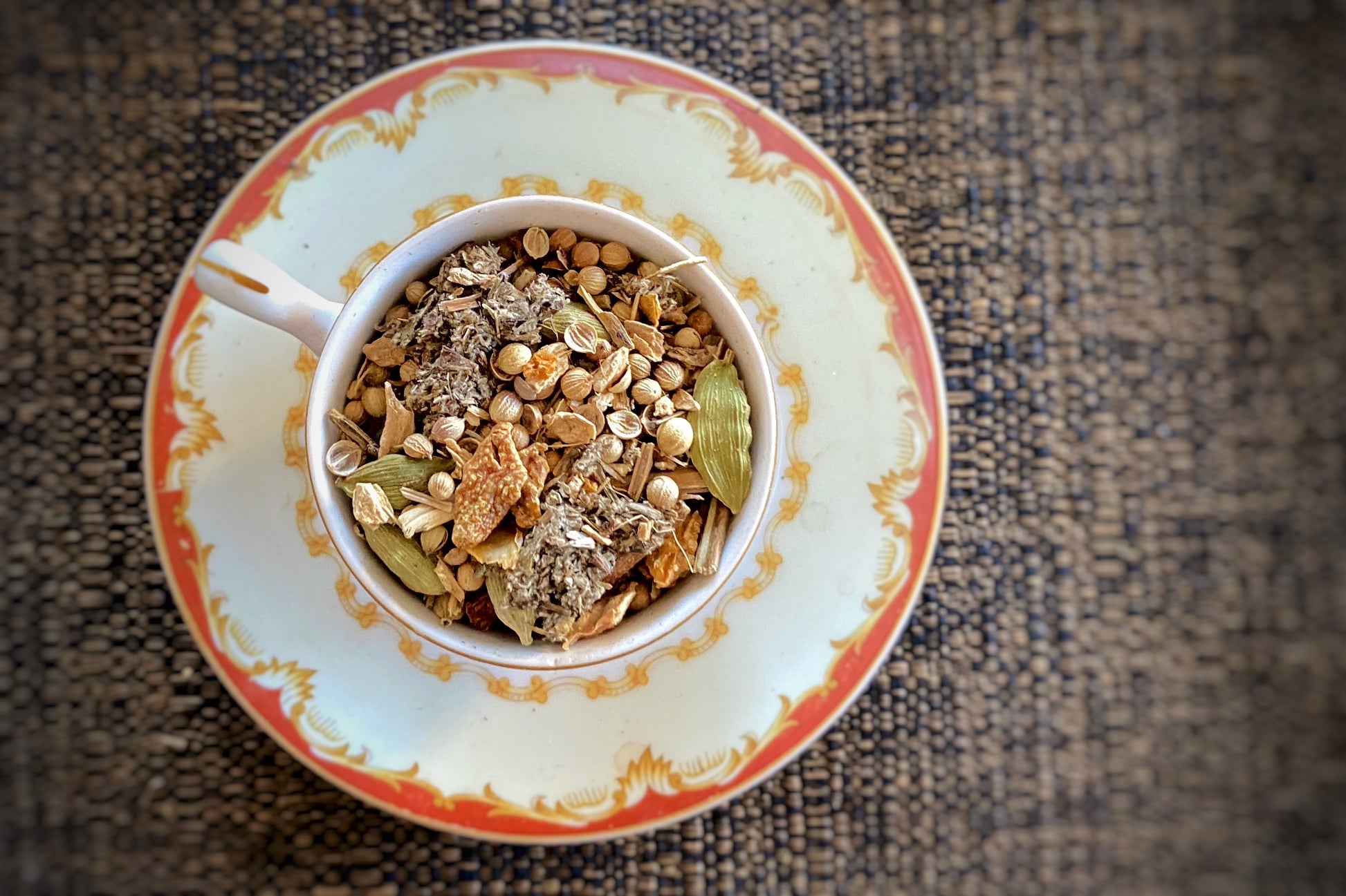 For those who follow their path zealously and with no care as to what others think, this weirdo blend is all you. A truly surprising and intensely layered tisane featuring the nigh-metallic spice of an assertive coriander presence, accented by the dizzying perfume of green cardamom pod, compounded by the burning of extra spicy Indonesian ginger in the throat and the sinus-opening brightness of lemon peel, all carrying the soul-siphoning cosmic herbaceousness of mugwort leaf. Sound intense? Baffling, even? Deal with it, cutie. That's how The Eighth rolls.