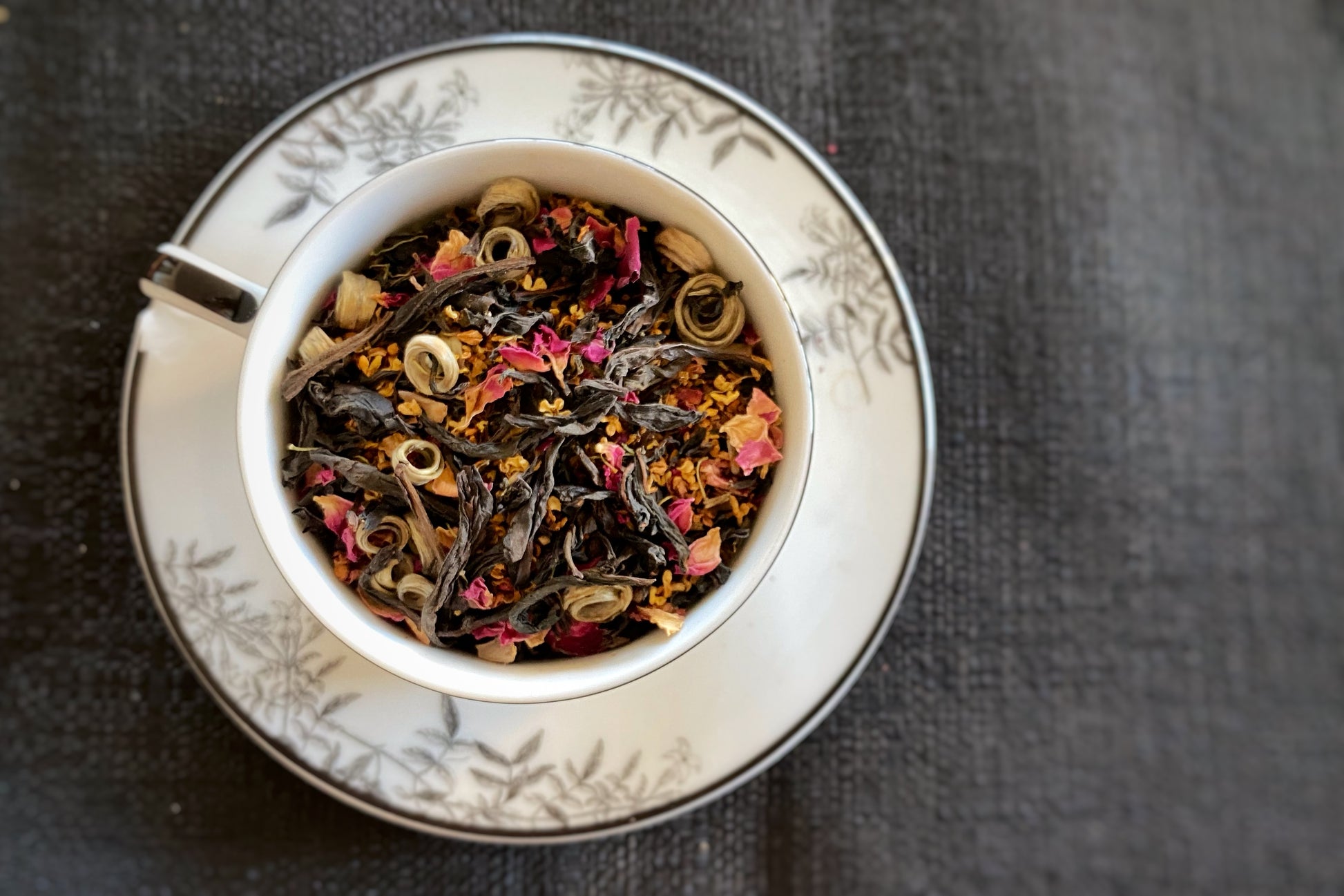 While undeniably floral, there are enough earthy/grassy notes in this blend to keep everything balanced. Not sure which component it is—maybe the osmanthus?—but there’s a nearly mineral finish that I enjoy a lot. It takes sweeteners well, especially honey!