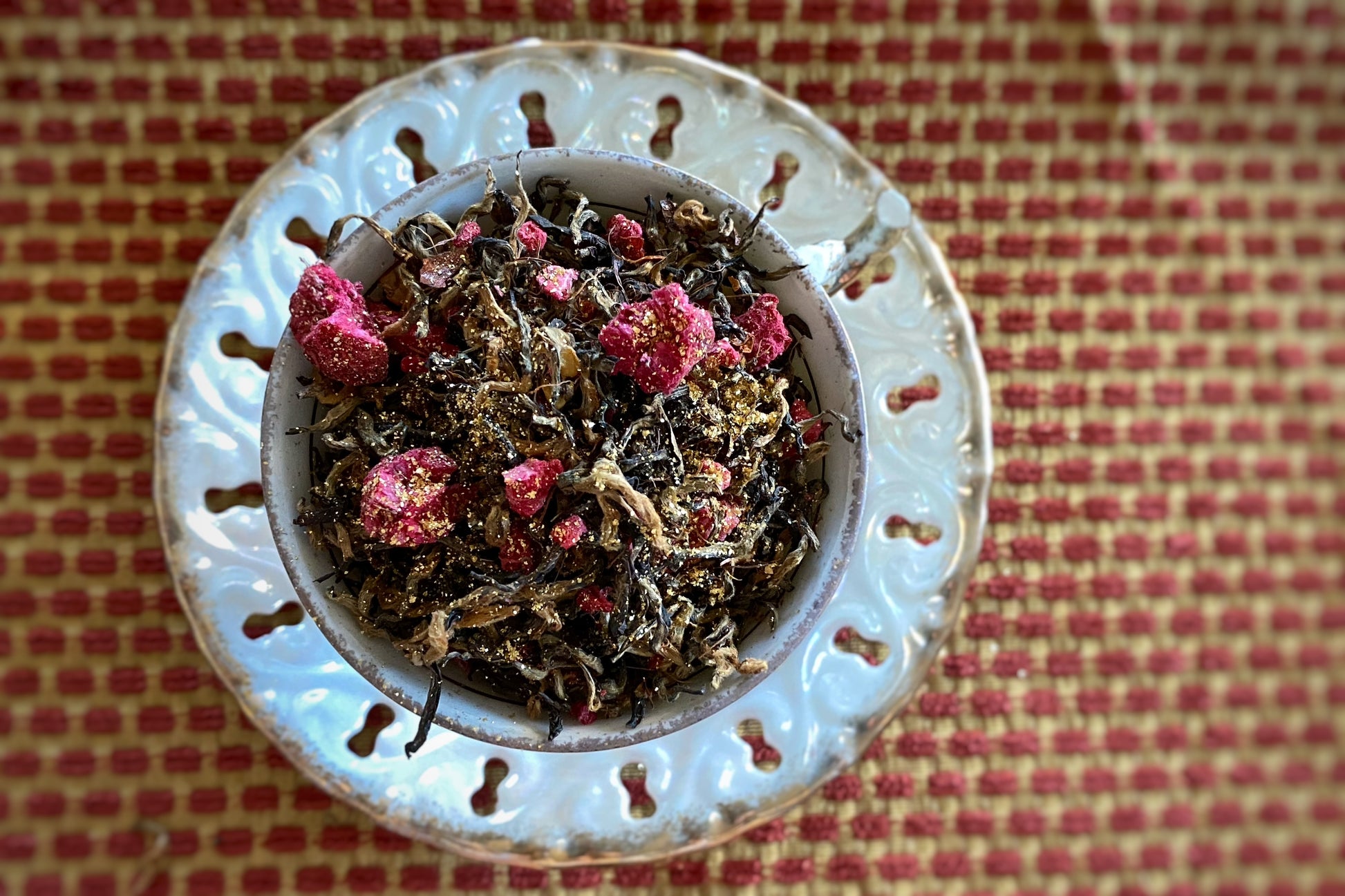 Ingredients: Black tea, honey granules (cane sugar, honey), raspberry, red chili flake, corn silk, natural vanilla flavoring, gold lustre dust*