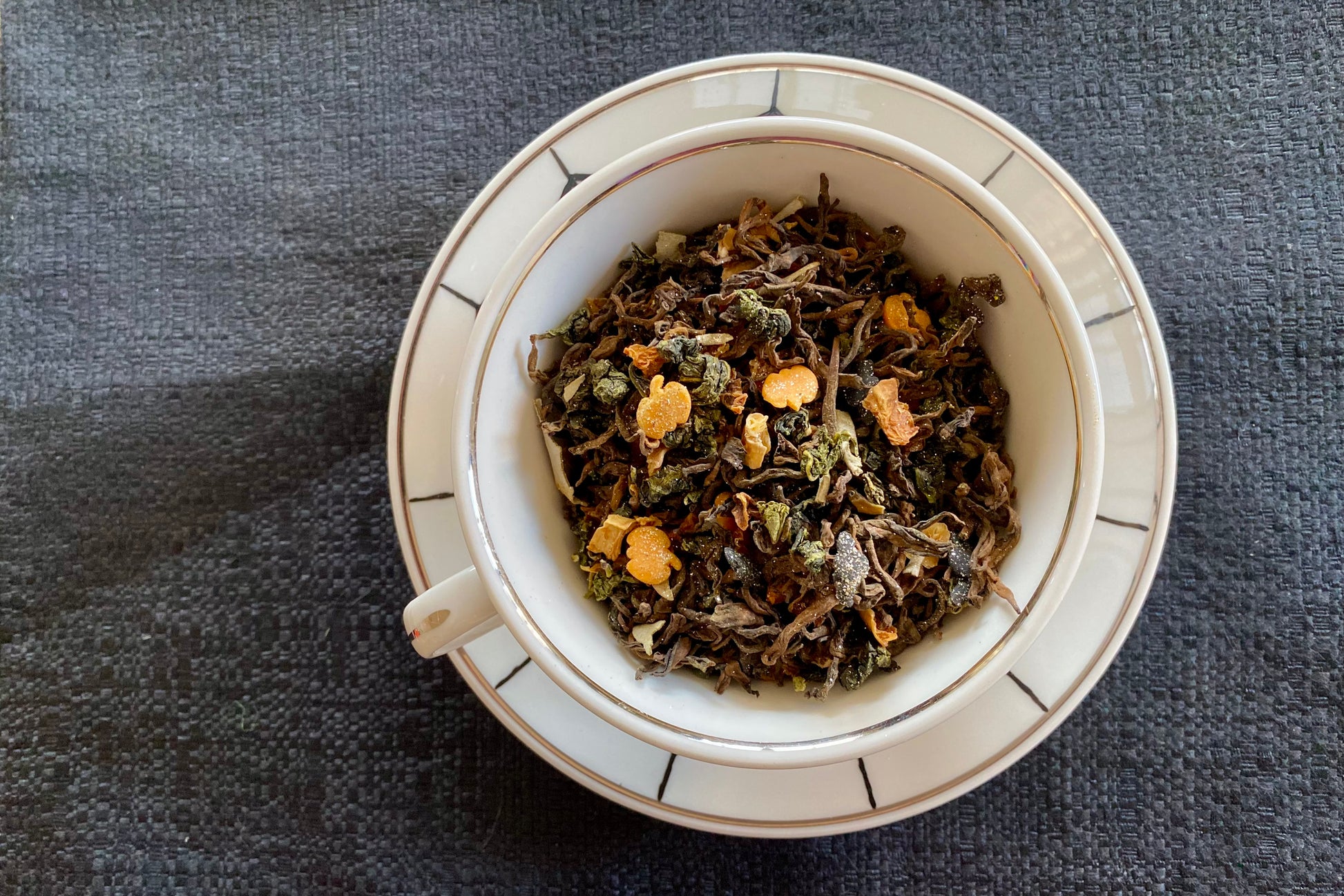 Ingredients: Puer tea, oolong tea, squash, bat & pumpkin sprinkles*, white sage, natural toffee flavor, gold lustre dust*
