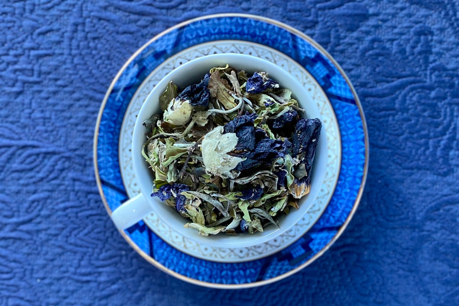 Ingredients: White tea, blue pea flower, hollyhock, mugwort, natural almond flavoring