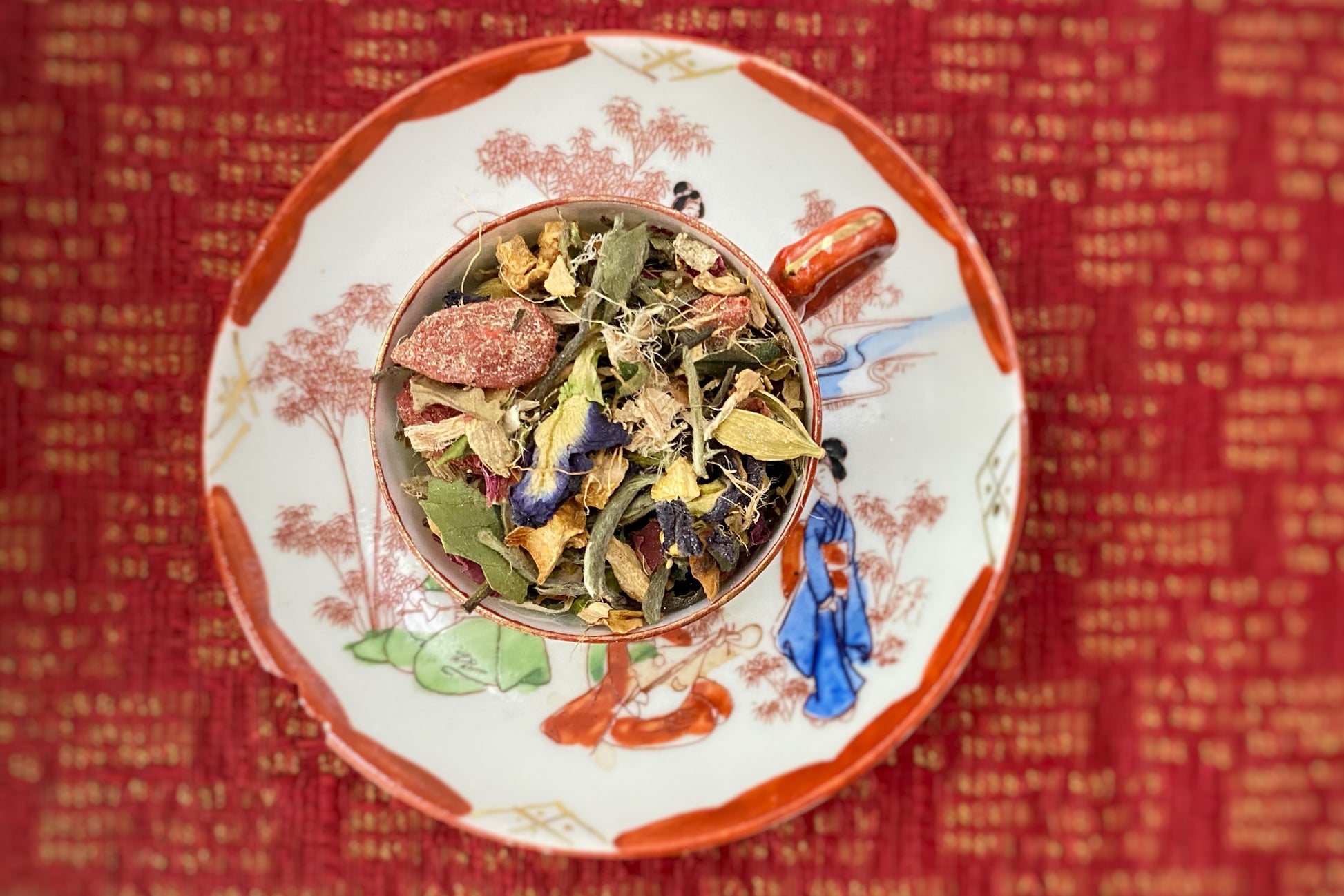 Love a bit of flush in your cheek and warmth in your belly? Looking for the perfect cuppa to pair with your fave fanfic or current romance read? This indecent infusion is for you, boasting a rich purple hue with a seductive sparkle. Slippery elm and marshmallow root bring a soothingly seductive throat-coat function and the irresistible aroma of cardamom and rose will have you feeling some kind of way. We created this carnal concoction in collaboration with our dear friend, The Lady Dame.