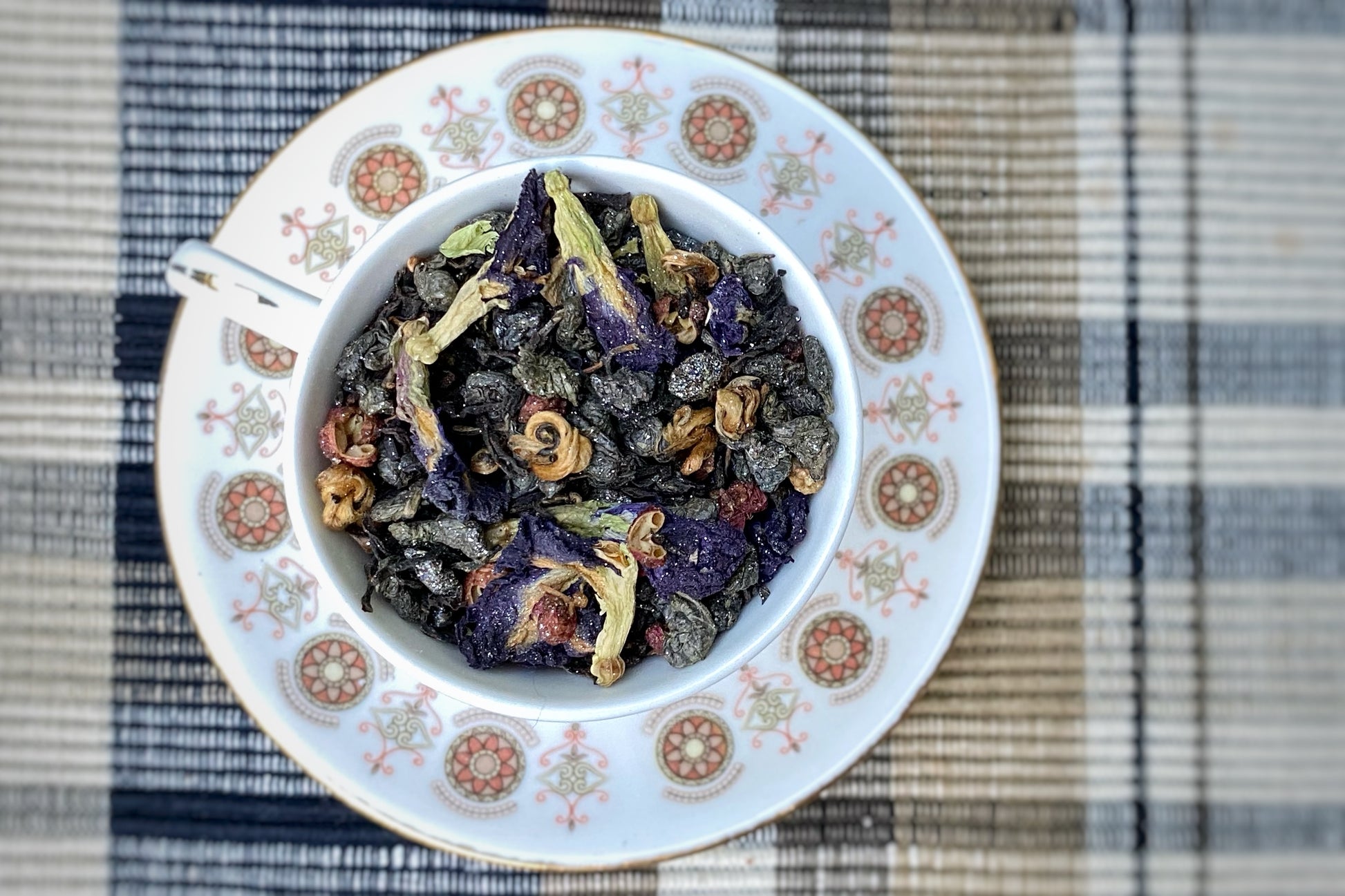 Ingredients: Black teas, green tea, Szechuan peppercorn, blue pea flower, natural brandy flavoring, silver lustre dust*