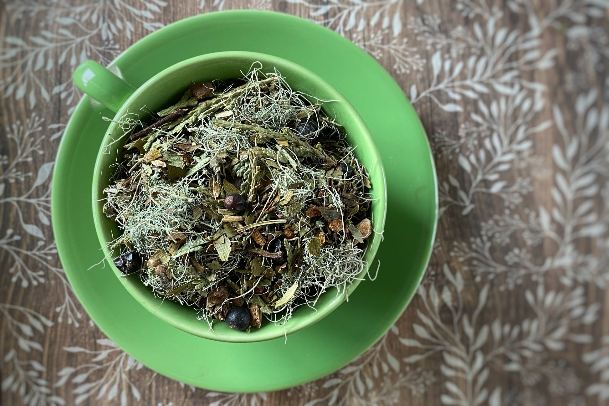 From the moment you open the package, you're greeted with an awe-inspiring visual display. The blend features an impressive array of large, high-quality ingredients, including generous chunks of Old Man's Beard lichen and Western Red Cedar tips. The sheer uniqueness of these components sets this tea apart, making it a true conversation piece when stored in a clear container.