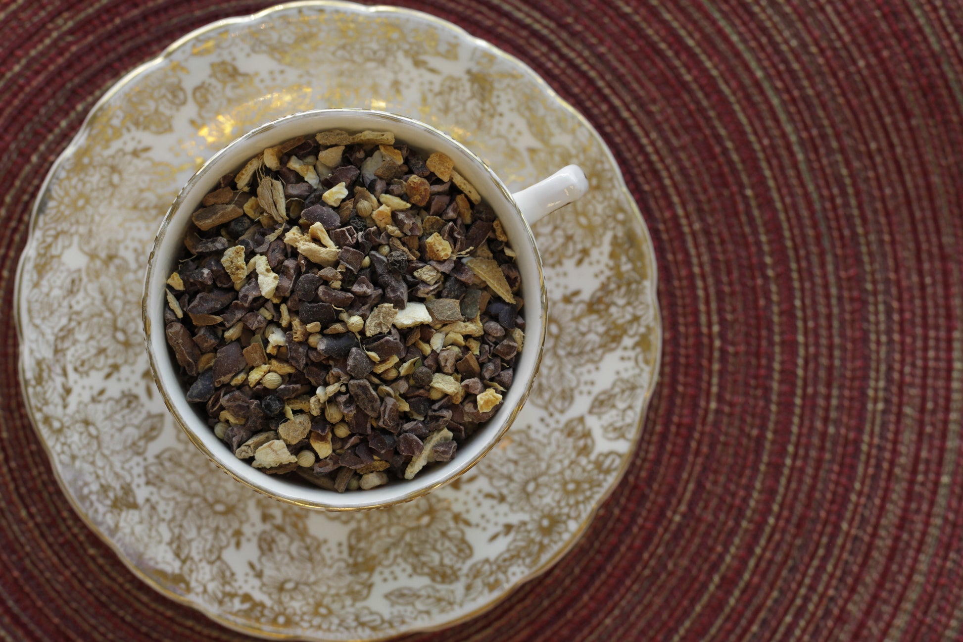 Ingredients: Cacao nib, orange peel, cinnamon, ginger, coriander, black peppercorn