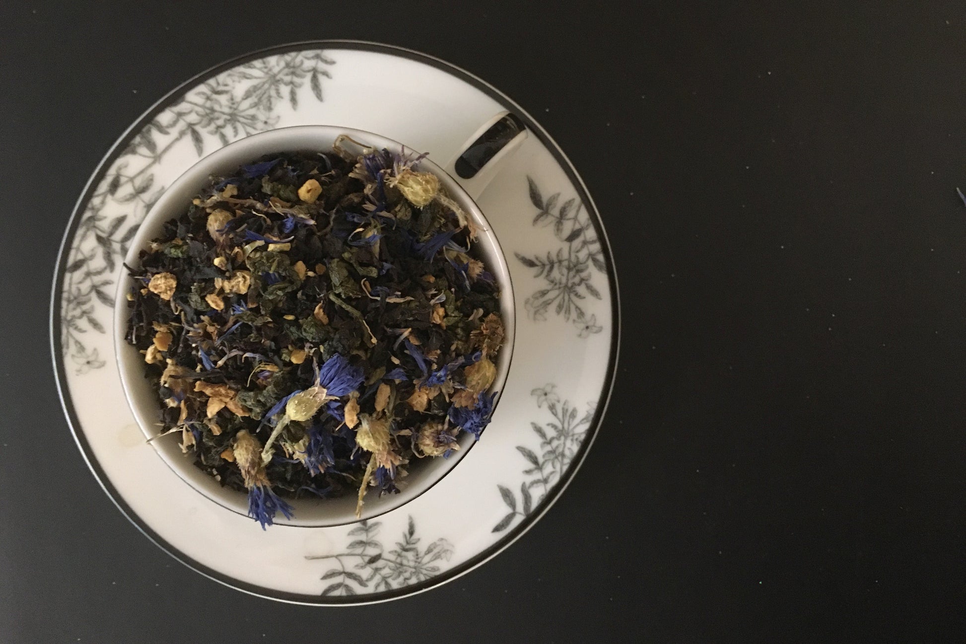 Ingredients: Black tea, oolong tea, ginger, blue cornflower, lime peel, natural coconut flavoring