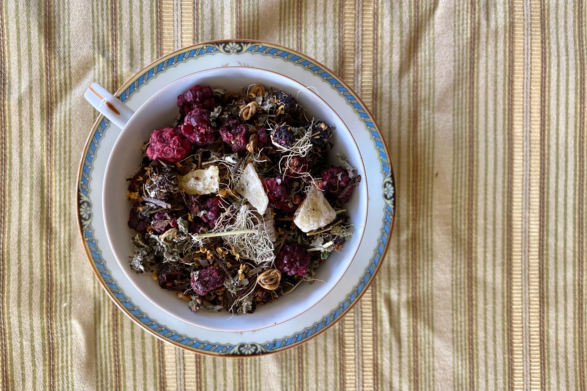 Ingredients: Roasted green tea, aloe vera, black tea, osmanthus, blackberry, blueberry, raspberry leaf, Old Man's Beard lichen
