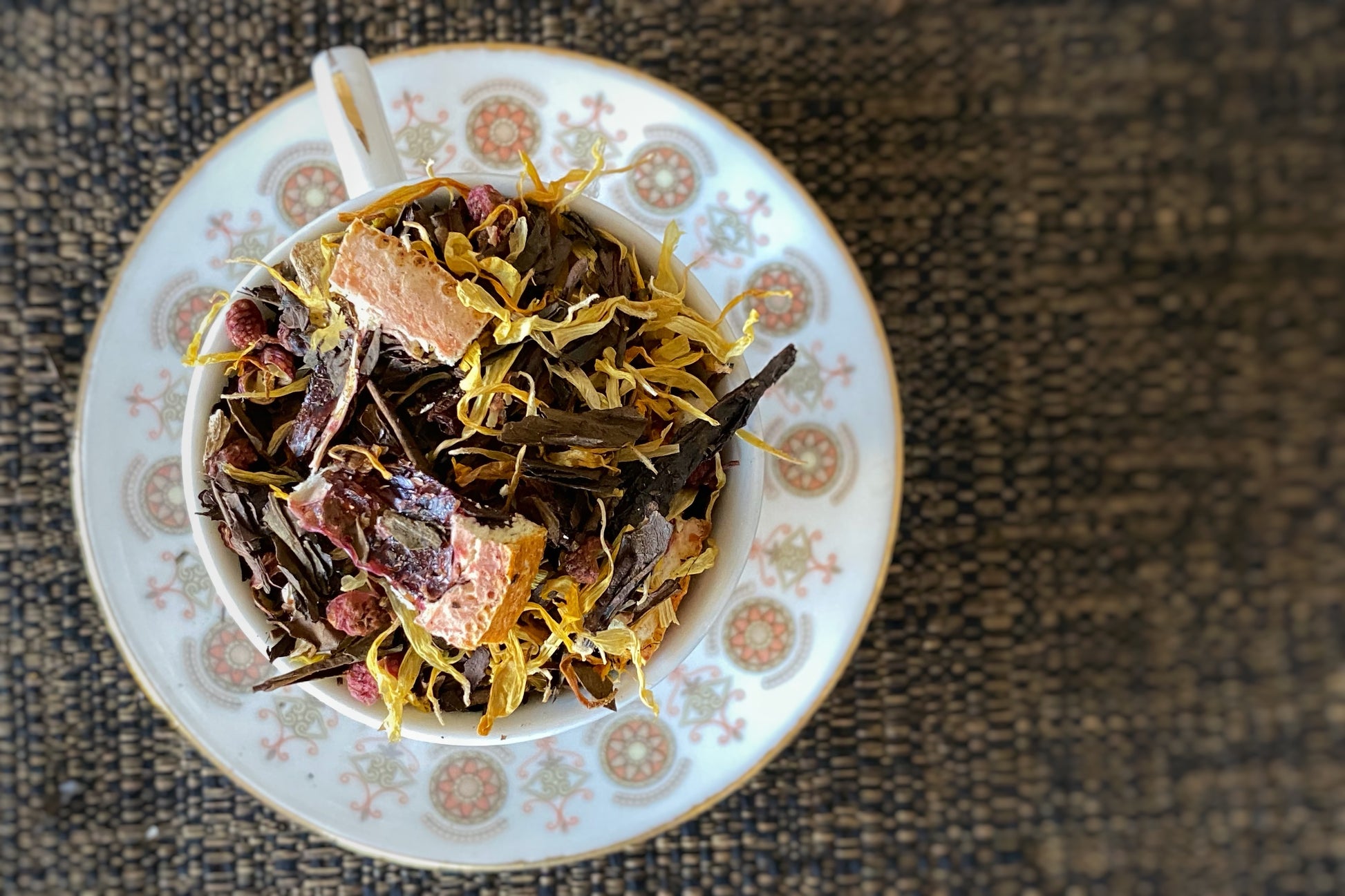 Ingredients: Roasted green tea, blood orange, burdock root, Szechuan peppercorn, marigold, natural cinnamon flavoring